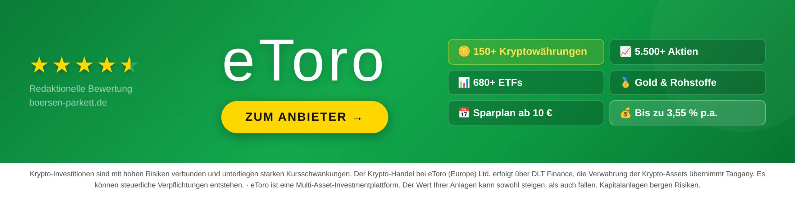 Wenn ihr überzeugt von der künftigen Entwicklung von Aktien seid, dann empfehlen wir euch den Testsieger eToro, über den ihr einfach und sicher investieren könnt. Hier geht es zu unseren eToro Erfahrungen.