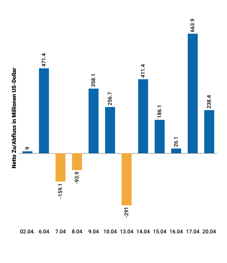 Parallel dazu zeigt auch der institutionelle Kapitalfluss ein klares Bild: Die Bitcoin-ETFs verzeichnen im April 2026 wieder deutlich positive Zuflüsse. Besonders an einzelnen Tagen summieren sich die Nettozuflüsse auf mehrere hundert Millionen US-Dollar – mit klarer Dominanz großer Anbieter wie BlackRock und Fidelity Investments. Insgesamt ergibt sich daraus im Monatsverlauf ein Nettozufluss von rund 2,1 Milliarden US-Dollar – ein weiteres Signal dafür, dass institutionelle Investoren trotz kurzfristiger Schwankungen weiter Kapital in den Markt lenken.